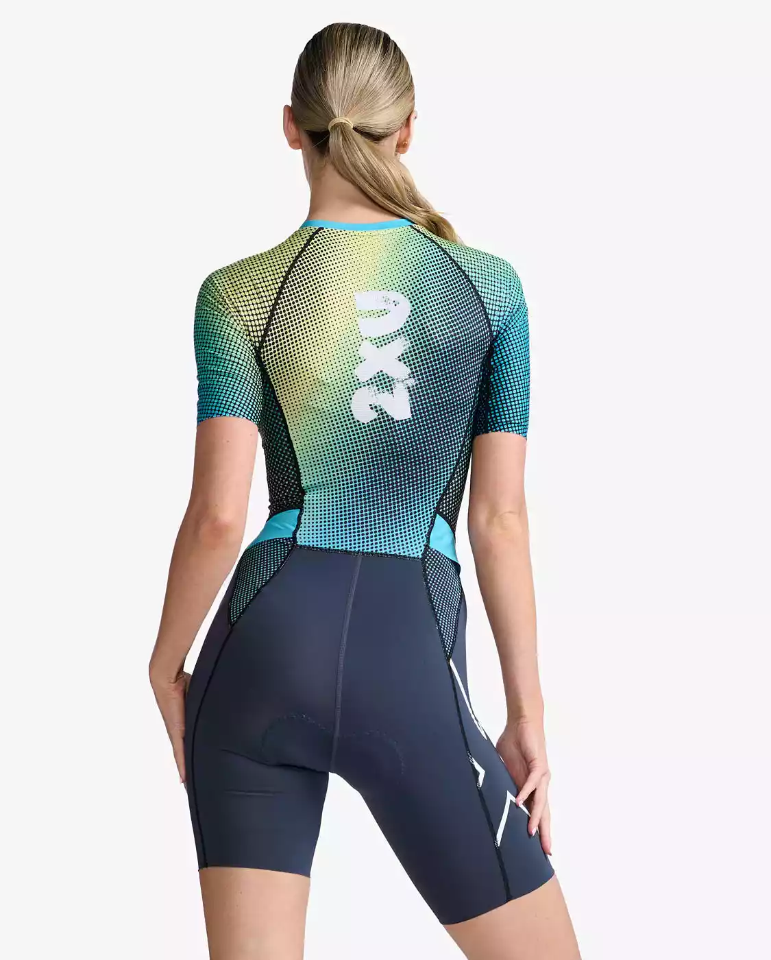 Het 2XU Aero trisuit korte mouw is in de schouders en zijpanelen voorzien van een 3D structuur en een naadloze mouwafwerking van SBR channel.