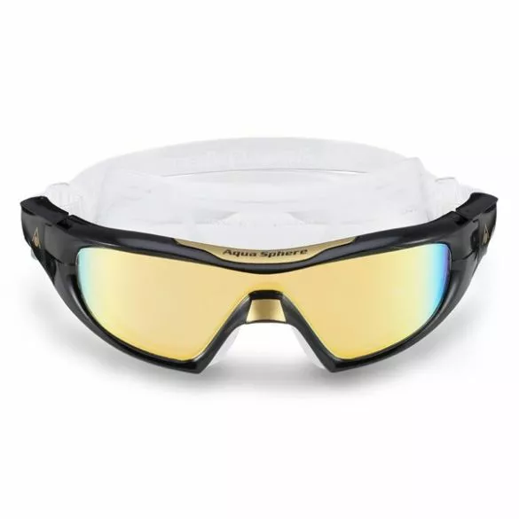 De Aqua Sphere Vista Pro multilayer mirror lens zwembril zwart biedt een 180 graden panoramisch gezichtsveld dankzij de gebogen enkele lens.