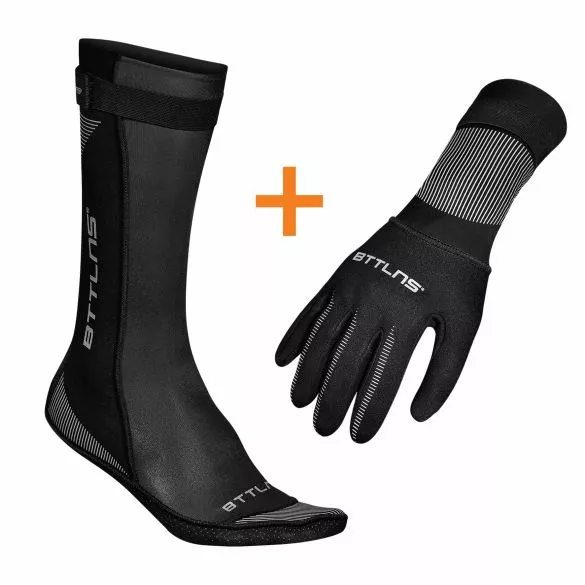 De BTTLNS voordeelset bestaat uit de Neopreen zwemsokken Caerus 1.0 en de Neopreen zwemhandschoenen Boreas 1.0, deze zijn essentieel om je voeten en handen warm te houden tijdens het zwemmen in koud water.Â