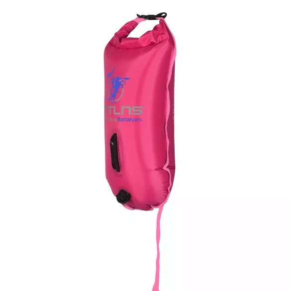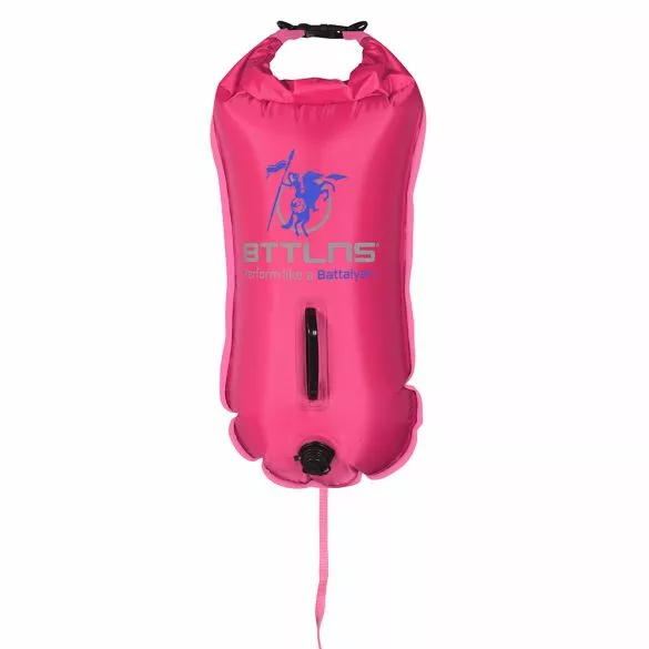 Deze felgekleurde opblaasbare BTTLNS Saferswimmer zwemboei 28 liter Poseidon 1.0 roze is ideaal voor het opbergen van je uitrusting terwijl je zwemt en uitstekend als opblaasbare boei voor een verhoogde zichtbaarheid in open water.