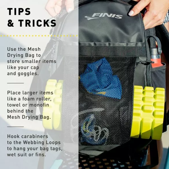 – Vak van gaas: handig droogvak van gaas aan de voorkant van de tas voor eenvoudige toegang tot en opslag van natte voorwerpen; til het droogvak van gaas op om grotere voorwerpen zoals een schuimroller, handdoek of monovin op te bergen zonder de omvang