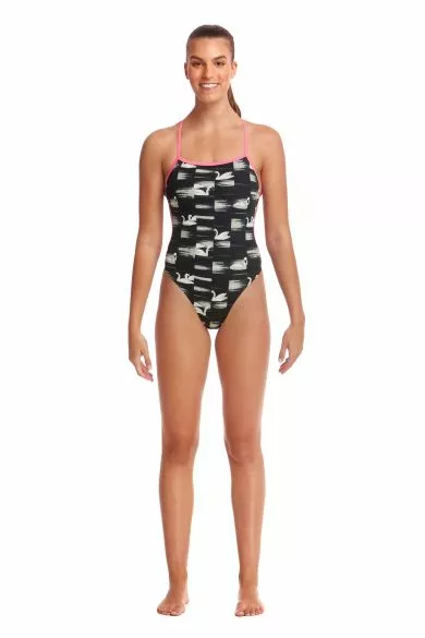 De Funkita Black Swan First twisted badpak dames is voorzien twee enkele schouderbandjes die op de rug samenkomen en daar om elkaar heen binden.