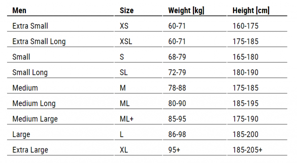 | Maak uw keuze | XS, S Lengte: 165-180 cm, gewicht: 68-79 kg, M Lengte: 175-185 cm, gewicht: 78-88 kg, L Lengte: 185-200 cm, gewicht: 86-98 kg, XL Lengte: 185-205+ cm, gewicht: 95+ kg, XXL |